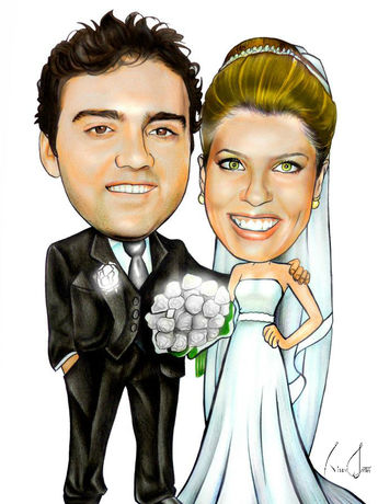 Agora a ocasião é mais do que especial! A caricatura de noivos é a marca do casamento. Ela vai estar na festa num banner bem grandão, nos convites, no bolo, nas lembrancinhas, enfim, é uma forma de todos os convidados lembrarem desse dia mágico onde o amor será selado com a alegria dessa união! Registre na caricatura um fato que tenha marcado a história do casal, vibrações positivas para os noivos. Confira abaixo nas galerias as diversas situações para fazer a sua caricatura de noivos e divirta-se!